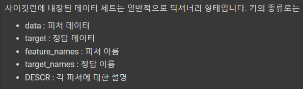 key는 보통 data, target, target_name, feature_names, DESCR 입니다.