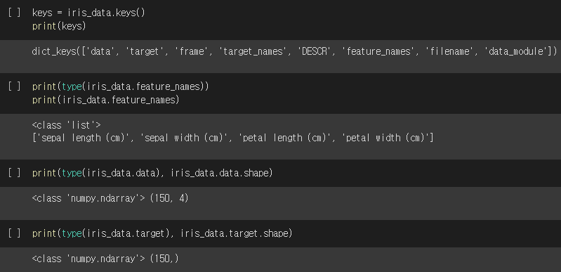 data, target은 넘파이 배열 타입이며, target_names, feature_names는 넘파이 배열 또는 파이썬 리스트입니다.