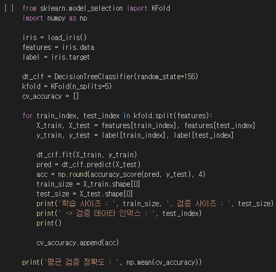KFold 객체는 split()을 호출하면 학습용/검증용 데이터로 분할할 수 있는 인덱스를 반환합니다. 실제 데이터 추출은 해당 인덱스로 직접 해야 합니다.