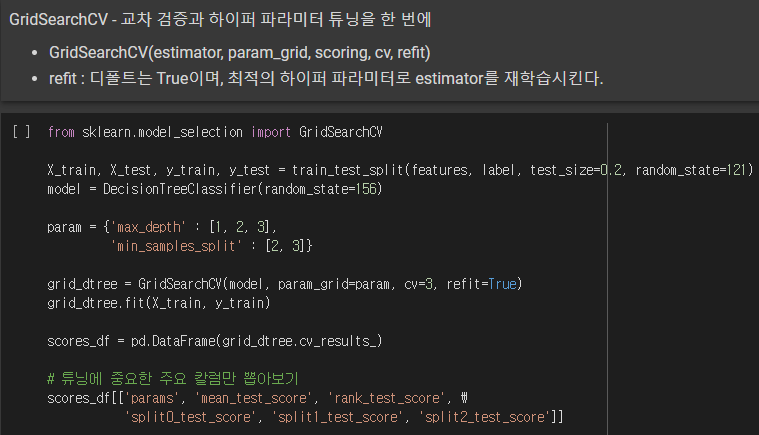 사이킷런에서는 GridSearchCV API를 이용해 Classifier나 Regressor와 같은 알고리즘에 사용되는 하이퍼 파라미터를 순차적으로 입력하면서 편리하게 최적 파라미터를 구할 수 있습니다. 각 하이퍼 파라미터 세트에 대해 교차 검증을 수행하여 가장 평가 지표가 높은 하이퍼 파라미터가 무엇인지를 찾습니다. 예를들어, 하이퍼 파라미터 풀의 크기가 6이고 폴드 개수가 3이라면 총 6*3 = 18번의 학습/평가가 이루어집니다.