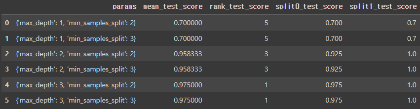 cv_result_를 DataFrame 객체로 변환한 후, 주요 칼럼만 뽑아봅시다. rank_test_score 칼럼은 각 하이퍼 파라미터의 순위입니다. mean_test_score는 모든 폴드에서의 평가 성능의 평균값이며, 이를 기반으로 순위가 매겨진 것을 볼 수 있습니다. 또한, 각 폴드마다의 평가 성능도 함께 제공됩니다.