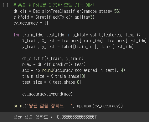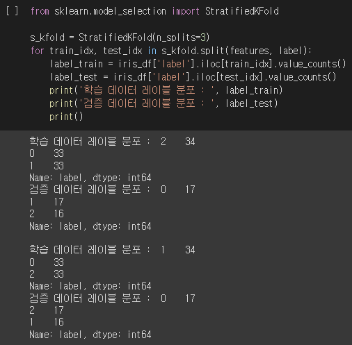 사이킷런에서 Stratified KFold를 이용하기 위해선 KFold() 메서드에 피처 데이터 뿐만 아니라 레이블 데이터도 함께 전달해야 합니다. 전체 데이터의 레이블 분포를 먼저 고려하고, 그것을 바탕으로 폴드의 학습/검증 데이터를 뽑기 때문입니다.