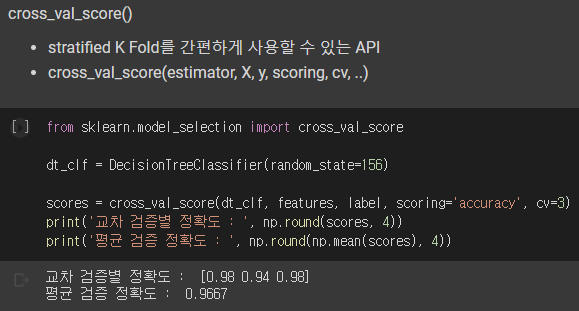 사이킷런은 교차 검증을 좀 더 쉽게 수행할 수 있는 API를 제공합니다. 대표적으로 cross_val_socre() 메서드가 있습니다.