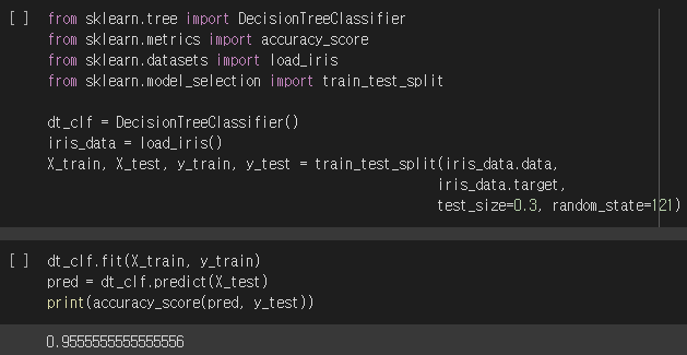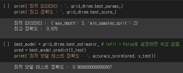 GridSearchCV 객체의 fit()이 수행되면 최고 성능을 기록한 하이퍼 파라미터와 그 때의 평가 결과가 각각 best_params_, best_score 속성에 기록됩니다. refit=True 이라면, best_estimator_ 속성에 최적의 하이퍼 파라미터로 학습시킨 estimator를 저장합니다. best_estimator_로 테스트 데이터에 대한 예측 성능을 평가했을 때 약 0.96의 결과가 나왔습니다.