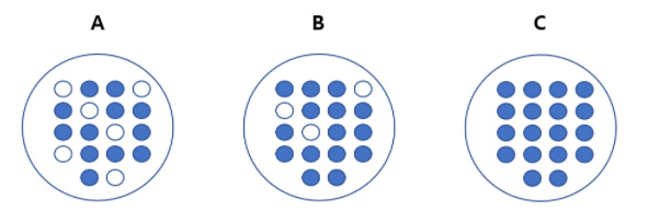 데이터 세트가 균일하다는 것이 어떤 의미인지를 알아봅시다. 위의 A, B, C 데이터 세트 중 가장 균일한 데이터 세트는 C입니다. 데이터 세트의 균일도는 데이터를 구분하는 데 필요한 정보의 양에 영향을 끼칩니다. C는 모두 같은 클래스의 데이터로 구성되어 있으므로 C에서 임의로 데이터를 뽑았을 때, 해당 데이터의 클래스를 매우 쉽게 알 수 있습니다. 하지만 A에서 임의로 데이터를 뽑았을 때, 해당 데이터의 클래스를 예측하는 데는 더 많은 정보가 필요합니다.