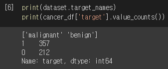 먼저 사이킷런에서 제공하는 위스콘신 유방암 데이터 세트를 가져온 뒤 DataFrame 객체로 만들어줍시다. 양성 종양을 뜻하는 malignant는 레이블 0이고, 악성 종양인 benign은 레이블 1입니다. 레이블의 분포를 보니, 두 레이블 데이터가 꽤 균등하게 분포한 것을 확인할 수 있습니다. 테스트 데이터를 20%로 설정한 뒤 XGBoost로 학습을 진행해봅시다.