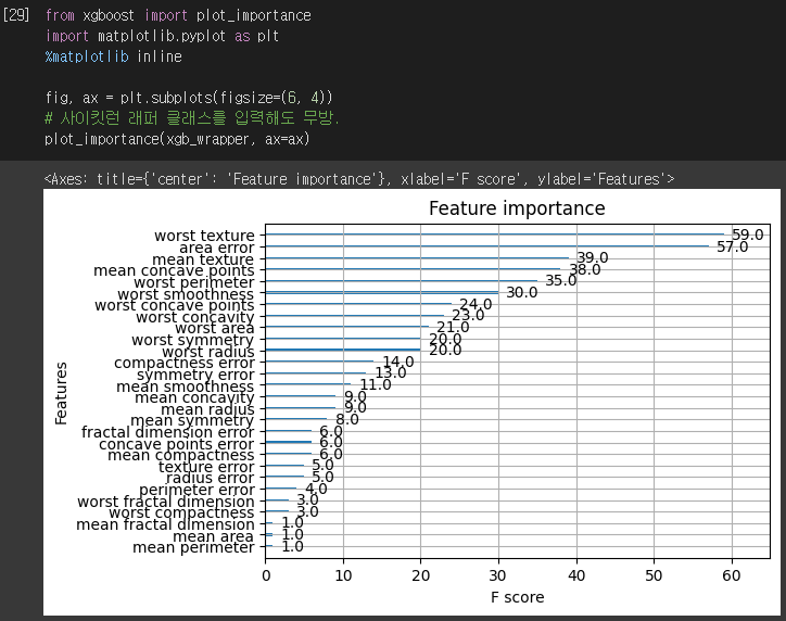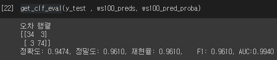 이전에 분류 모델을 다양한 평가 지표로써 평가하는 get_clf_eval() 메서드를 통해 XGBoost 모델의 예측 성능을 평가했습니다. 위스콘신 데이터 세트가 워낙 작기 때문에, 검증 데이터를 따로 분리하거나 교차 검증을 수행하면 성능 수치가 불안정한 경향을 보이기에 검증은 따로 수행하지 않았습니다. 데이터가 많다면 검증을 통한 조기 중단을 이용하여 과적합을 개선할 수 있어 모델 성능이 조금 더 향상될 수 있습니다.