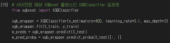 사이킷런 래퍼 XGBoost는 분류를 위해 XGBClassifier, 회귀를 위해 XGBRegressor 클래스를 제공합니다. n_estimators=400, learning_rate=0.1, max_depth=3으로 지정한 뒤 바로 학습을 진행했습니다.