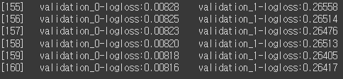 n_estimators가 400이지만, 160번째 반복에서 학습이 종료되었습니다. 이는 60번째 반복 이후 100회 동안 validation_1-logloss가 개선된 적이 없기 때문에 조기 중단되었기 때문입니다.