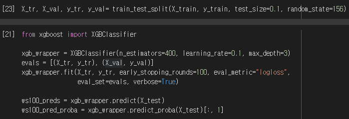 학습 데이터 세트를 다시 학습 데이터와 검증 데이터로 분리했습니다. XGBoost 객체의 fit() 메서드에 입력할 eval_set 객체에는 위의 코드에서 보이는 바와 같이 구성하면 됩니다. 첫 번째 튜플이 학습 데이터 세트, 두 번째 튜플이 검증 데이터 세트입니다.