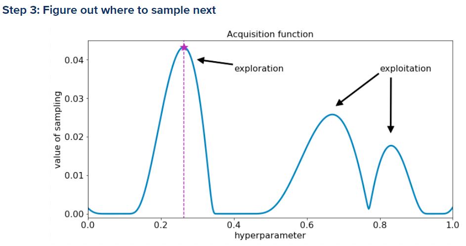 추정된 최적함수를 기반으로 획득 함수는 최댓값을 가질 가능성이 가장 높은 하이퍼 파라미터를 예측하여 대체 모델에게 다시 전달합니다.