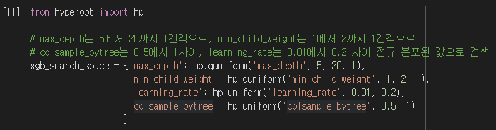 - hp.uniform(label, low, high) : low ~ high까지 정규 분포 형태의 검색 공간 설정