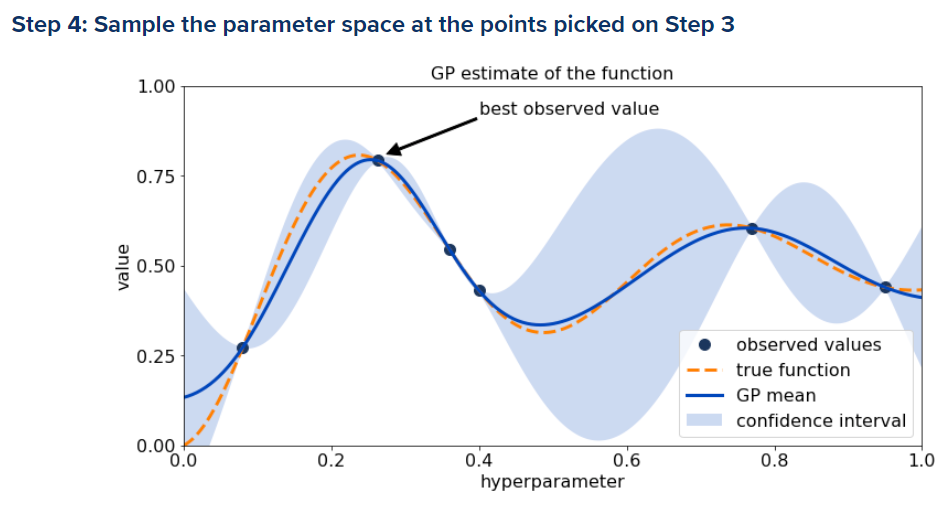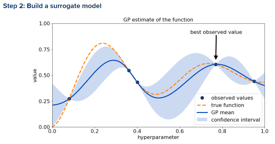 관측값을 기반으로 대체 모델은 최적 함수를 추정합니다. 파란색 실선이 대체 모델이 추정한 최적 함수이며, 음영 영역은 예측 함수의 신뢰 구간입니다. 즉, 일종의 불확실성입니다. 이때 관측값 중 최댓값을 기록한 하이퍼 파라미터를 최적 관측값이라고 합시다.