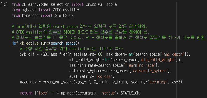 목적함수를 정의합니다. 주의해야 할 점은, HyperOpt는 입력값과 반환값이 모두 실수형 자료형이므로, XGBoost의 하이퍼 파라미터 설정시 정수형 타입으로 입력해야 하는 인자에 대해서는 형변환을 해줘야 한다는 것입니다. 또한 목적 함수의 최솟값을 찾게 되므로, 교차 검증의 평균 정확도에 -1을 곱한 값을 반환해야 합니다.