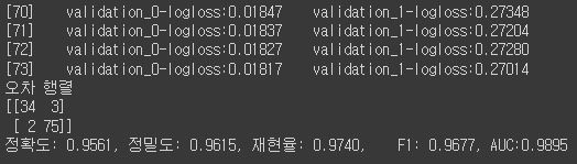 최적 하이퍼 파라미터로 학습시킨 XGBClassifier 모델의 예측 성능을 테스트 데이터로 평가한 결과입니다. 워낙 작은 데이터 세트로 학습, 검증, 테스트를 수행했기 때문에 fmin() 메서드 인자의 rstate 값을 변경할 경우 불안정한 성능 결과가 도출될 수 있습니다.