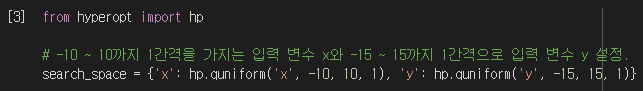 HyperOpt의 hp 모듈을 이용하여 입력 변수명과 입력값의 검색 공간을 설정합니다. 변수명과 검색 공간은 딕셔너리 형태여야 합니다. hp 모듈은 다양한 검색 공간을 설정할 수 있도록 여러 메서드를 제공합니다. 가령, quniform() 메서드로 -10부터 10까지의 값을 1의 간격으로 구성했습니다.