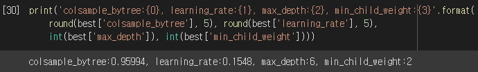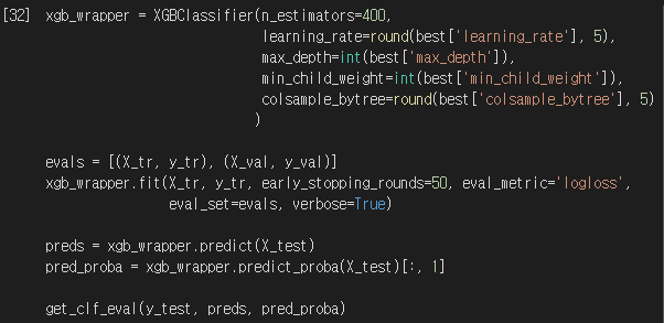 fmin()으로 추출된 최적 하이퍼 파라미터를 XGBClassifier 객체에 인자로 전달하기 전에, 마찬가지로 정수형 하이퍼 파라미터를 위한 형변환을 해줘야 합니다.