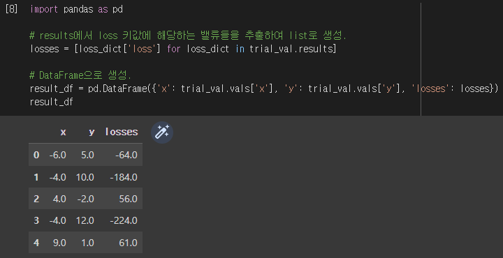 fmin() 메서드의 인자로 들어가는 Trials 객체는 시도한 입력값에 따른 함숫갑을 속성으로 기록합니다. 중요 속성으로 results와 vals가 있습니다. result는 반환값이며, vals는 시도한 입력값입니다.