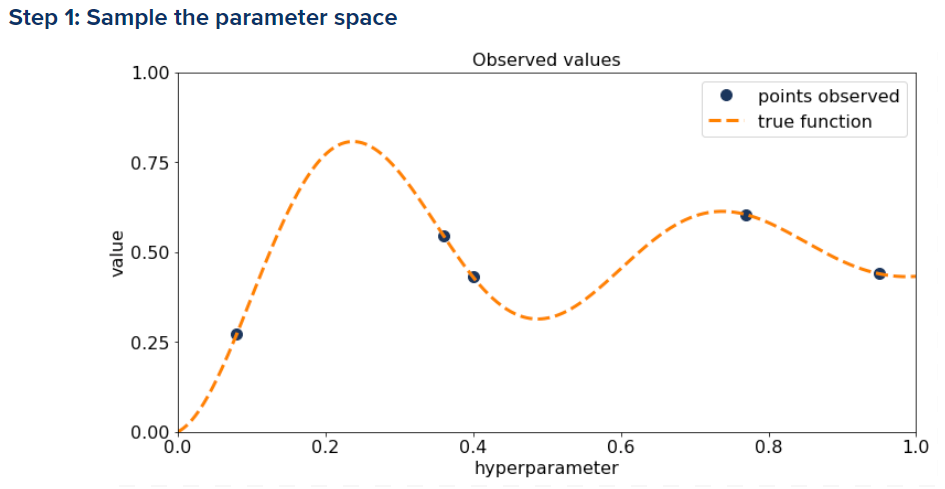 최초에, 랜덤한 하이퍼 파라미터를 기반으로 모델을 학습시킨 뒤 성능 지표를 관측합니다. 주황색 사선이 찾아야 할 실제 최적함수이며, 검은색 데이터가 관측값입니다.