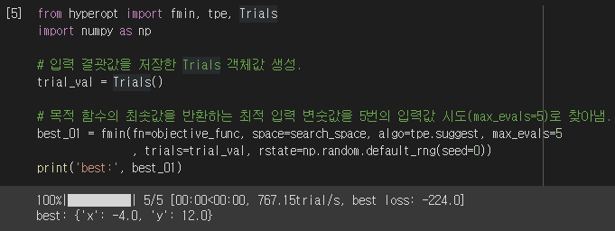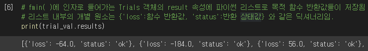 - trials : 시도한 입력값과, 그에 따른 목적 함수의 반환값을 저장하는 Trials 객체.