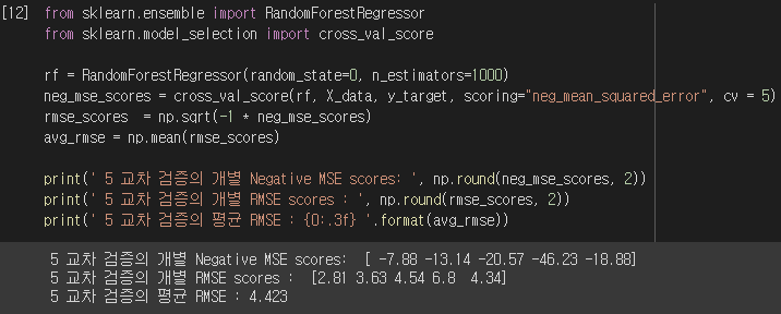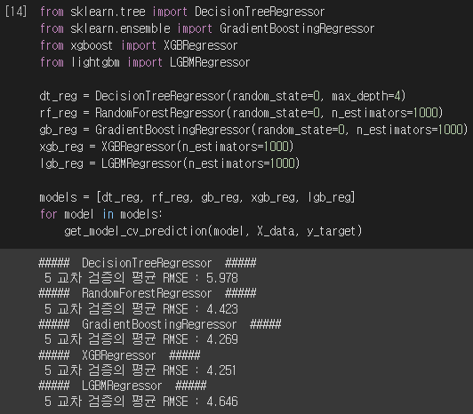 결정 트리, GBM, XGBoost, LightGBM의 Regressor 모두에 대해 보스턴 주택 가격 예측을 수행하기 위해 입력 모델과 데이터 세트를 받아 교차 검증을 수행하는 메서드를 정의했습니다.