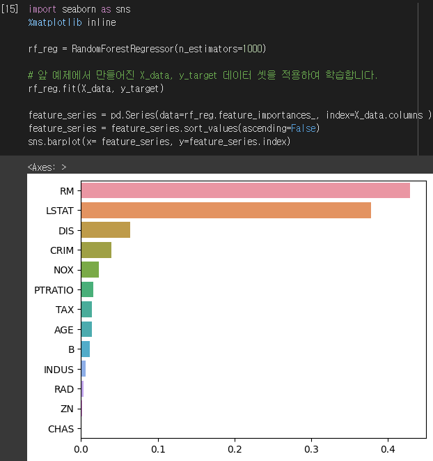회귀트리 Regressor 클래스는 선형 회귀와 다른 처리 방식으로 학습을 수행하므로 회귀 계수를 제공하는 속성을 가지지 않습니다. 대신 feature_importances_ 속성을 이용해 피처별 중요도를 확인할 수 있습니다.