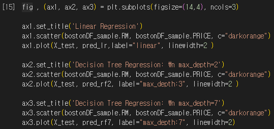 단순 선형 회귀 모델은 직선으로 예측 회귀선을 표현하는 데 반해, 회귀 트리의 경우 분할되는 데이터 지점에 따라 브랜치를 만들면서 계단 형태의 회귀선을 만들었습니다. max_depth가 7인 DecisionTreeRegressor의 경우 학습 데이터의 이상치까지 피팅하게 되면서 복잡한 계단 형태의 회귀선이 생성되면서 과적합에 취약한 모델이 되었음을 알 수 있습니다.