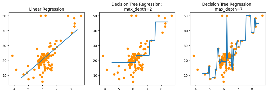 100개의 학습 데이터에 대해 LinearRegression와 max_depth가 각각 2, 7인 DecisionTreeRegressor를 학습시킵니다. 학습된 Regressor에대해 RM값을 4.5 ~ 8.5까지 100개의 균일한 데이터를 샘플링한 테스트 데이터를 제공합시다.