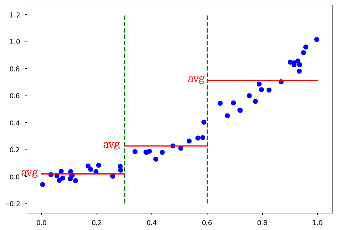 이제 회귀 트리에 대해 알아봅시다. 회귀 트리는 분류에서 언급했던 분류 트리와 크게 다르지 않습니다. 다만 리프 노드에서 예측 결정 값을 만드는 과정에 차이가 있습니다. 분류 트리가 특정 클래스 레이블을 결정하는 것과 달리, 회귀 트리는 리프 노드에 속한 데이터 값의 평균값을 구해 회귀 예측값을 계산합니다.