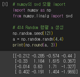 넘파이는 numpy.linalg.svd API로 SVD 연산을 지원합니다. SVD를 적용할 행렬은 랜덤 행렬로 만들었습니다. 랜덤 행렬을 생성하는 이유는 행렬의 개별 로우끼리 의존성을 가지지 않도록 하기 위해서입니다.