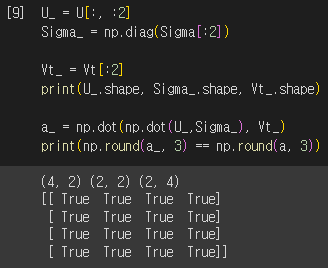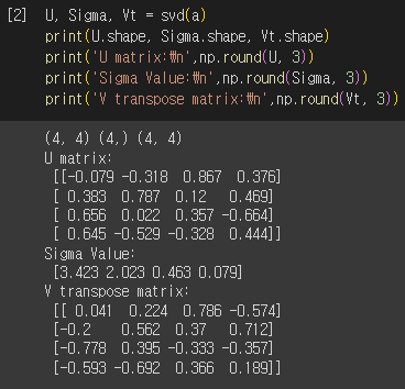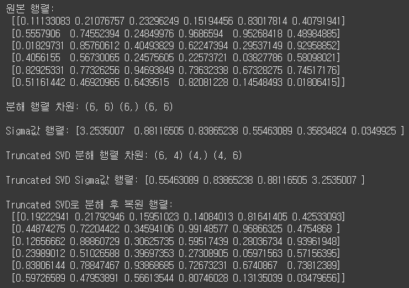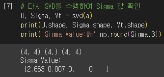 특이값이 0인 부분을 제외하고 행렬곱을 수행하더라고 원본 행렬을 그대로 복원해낸 것을 확인할 수 있습니다.