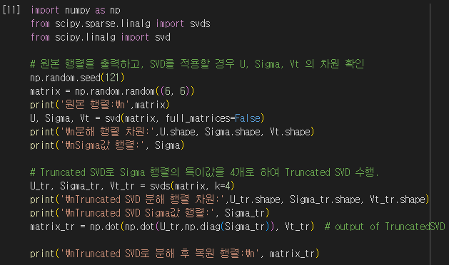 Tuncated SVD는 넘파이가 아닌 사이파이에서만 지원됩니다. Truncated SVD는 희소 행렬로만 지원돼서 spicy.sparse.linalg.svds를 이용해야 합니다.