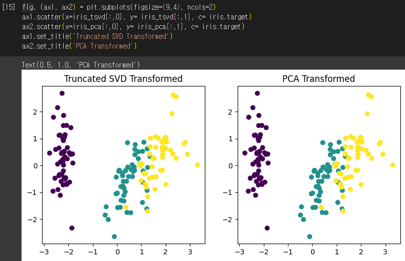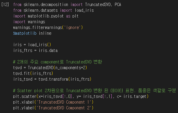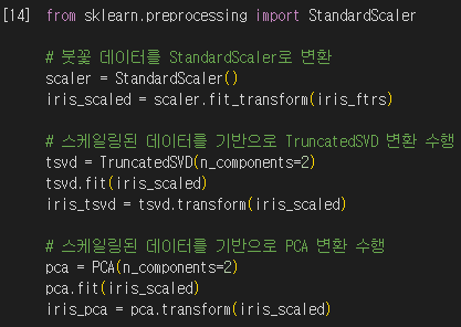 Truncated SVD를 통해 4개의 피처를 2개의 피처로 압축하더라도 세 종류의 붓꽃이 꽤 잘 구분되는 것을 확인할 수 있습니다.