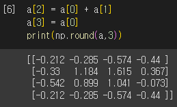 이번에는 원본 행렬의 로우 간에 의존성이 있을 경우 $\sum$이 어떻게 변하고, 이에 따른 차원 축소가 진행될 수 있는지 알아봅시다. 로우 간의 의존성을 부여하기 위해 원본 행렬의 세 번째 로우를 첫 번째 로우와 두 번째 로우의 합으로, 네 번째 로우는 첫 번째 로우와 같도록 만들겠습니다.