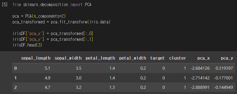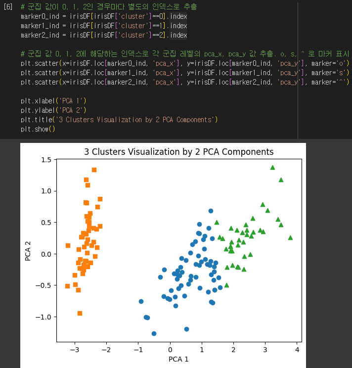 이번에는 군집화 결과를 시각화해봅시다. 2차원 평면상에 개별 데이터를 시각화하려고 합니다. 붓꽃 데이터 세트의 피처가 4개이므로, PCA를 통해 2개의 피처로 축소합시다.