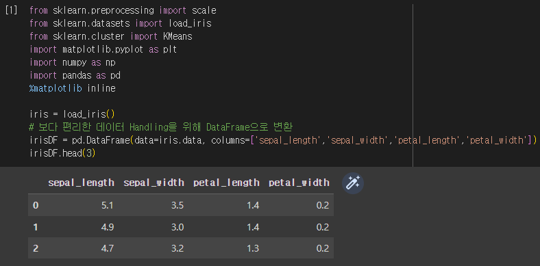 분류 타깃값이 0인 데이터는 1번 군집으로 모두 잘 군집화되었습니다. 타겟값이 1인 데이터 중 2개만 2번 군집으로 그루핑되었고, 나머지 48개의 데이터는 모두 0번 군집으로 그루핑됐습니다. 하지만 타겟값이 2인 데이터는 0번 군집과 2번 군집에 분산돼어 그루핑됐습니다.