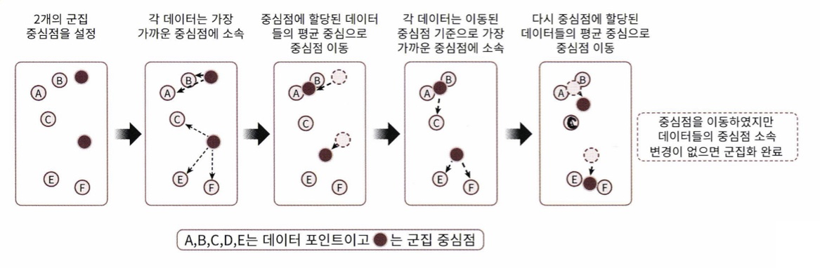 - 각 데이터는 자신과 가장 가까운 중심점에 소속됩니다. 위 그림에서 처음에 A, B 데이터가 같은 중심점에 소속되며, C, E, F 데이터가 같은 중심점에 소속됩니다.