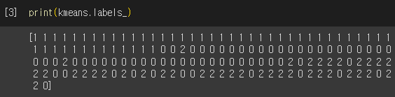 붓꽃 데이터 세트를 3개의 군집으로 군집화해봅시다. fit() 메서드를 수행하여 데이터 세트에 대한 군집화 결과가 kmans 객체 변수로 반환됐습니다. 해당 객체의 labels_ 속성을 확인하여 각 데이터가 어떤 군집에 속하는 지를 알 수 있습니다.