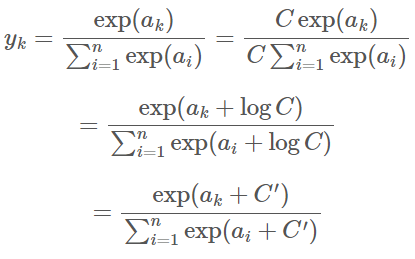 $n$은 출력층의 뉴런 수, $y_{k}$는 그중 $k$번째 출력이다. 위 식을 컴퓨터로 계산할 때 오버플로 문제가 발생할 수 있다. 지수 함수가 매우 큰 값을 뱉을 수 있기 때문이다. 소프트맥스 함수의 계산을 개선하여 이 문제를 피할 수 있다.