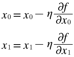 경사 하강법을 수식으로 나타내면 위와 같다. $\eta$는 갱신의 양을 나타낸다. 이를 학습률(learning rate)라고 한다. 학습률은 하이퍼파라미터이다.