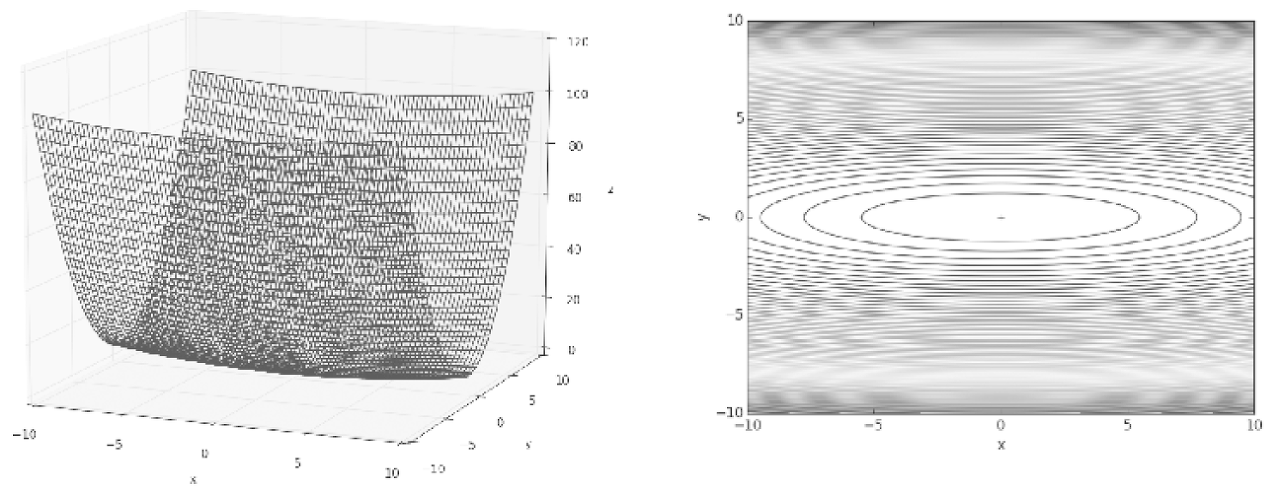 SGD는 단순하고 구현도 쉽지만, 문제에 따라서 비효율적인 경우가 있다. 아래와 같은 비등방성 함수에서 그렇다. 비등방성 함수란 각 지점에서의 기울기가 전체에서 한 점만을 가리키지 않는 함수라고 이해하면 된다.