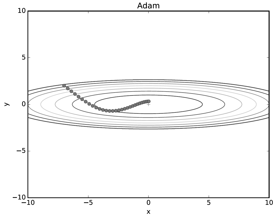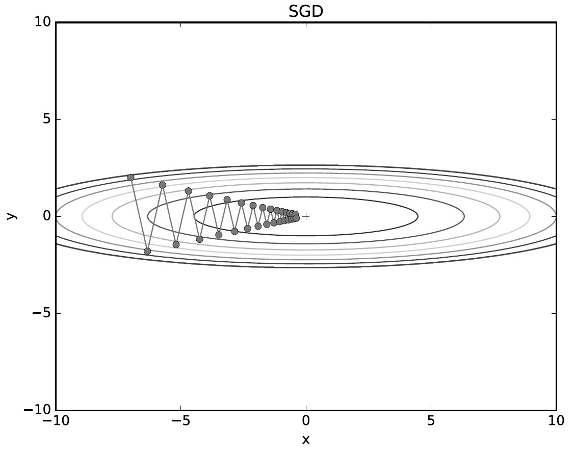 이는 $x$축의 힘은 아주 작지만 방향은 변하지 않아 한 방향으로 일정하게 가속하기 때문이다. $y$축의 힘은 크지만 위아래로 번갈아 받아서 상충하여 $y$축 방향의 속도는 안정적이지 않다. 전체적으로 SGD보다 $x$축 방향으로 빠르게 다가가 지그재그 움직임이 줄어들었다.