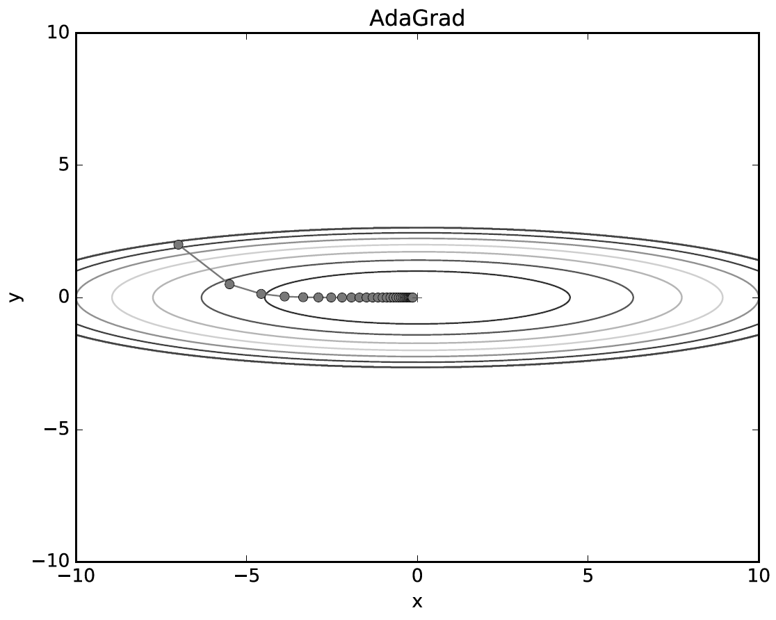 AdaGrad로 위 함수의 최적화 문제를 풀어봤다. 최솟값을 향해 효율적으로 움직인 것을 볼 수 있다. $y$축 방향은 기울기가 커서 처음에는 크게 움직이지만, 그 움직임에 비례해 갱신 정도도 큰 폭으로 작아지도록 조정된다. 그 결과 $y$축 방향의 갱신 강도가 빠르게 약해지고, 지그재그 정도가 줄어든다.