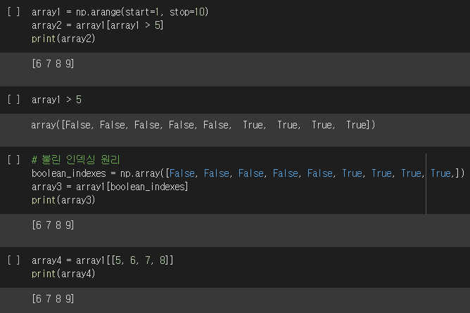 불린 인덱싱은 조건 필터링과 검색을 동시에 수행해주기 때문에 매우 자주 사용됩니다. 대괄호 내에 조건을 적어주면, 해당 조건을 만족하는 원소만 추출해줍니다. array1 > 5의 반환값은 ndarray의 모든 원소에 대한 조건식의 결과를 담고있는 ndarray 객체입니다. 이 객체가 array1의 대괄호 안에 들어가기 때문에, array1에 대한 팬시 인덱싱입니다. False는 무시하고, True 값이 있는 위치 인덱스 값으로 자동 변환되어 해당하는 인덱스 위치의 데이터만 반환합니다. 즉, [5, 6, 7, 8]이 만들어지고 해당하는 위치의 값만 팬시 인덱싱됩니다.