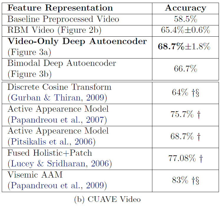 (a) AVLetters는 알파벳 발음 분류 데이터셋이고, (b) CUAVE Video는 숫자(0~9) 발음 분류 데이터셋이다. 두 가지 데이터셋에 대해, 비디오로만 classifier를 학습한 cross modality learning을 수행한 결과이다. 여기서 bimodal autoencoder가 video-only deep autoencoder 보다 accuracy가 낮다. video-only autoencoder는 오직 비디오만 인풋으로 받기 때문에, 비디오에 관련된 표현을 배운다. 하지만 그 표현은 오디오를 reconstruction하는데도 역시 좋은 것이다. 이에 반해 bimodal autoencoder는 audio-only, video-only, invariant 피처를 각각 배운다. 그래서 classifier 학습시 비디오 인풋만 주어지면 아마도 optimal이 아닌 것 같다고 저자들은 말한다.