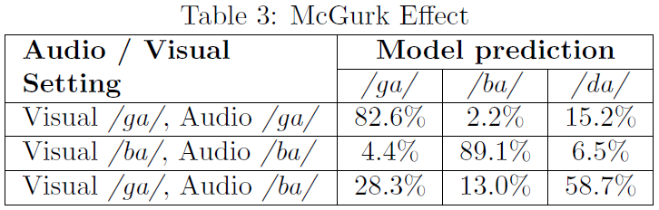 McGurk effect란, 사람에게 소리는 "ga"로 들려주는 동시에 입 모양은 "ba"로 보여주면 결과적으로 "da"로 인식하는 것을 말한다. 이는 사람을 대상으로 할 때 발생하는 것인데, 과연 멀티모달 표현으로 학습한 모델에서도 이런 효과가 일어날까?