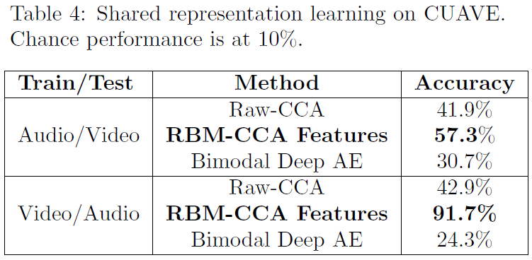 오디오/비디오의 raw input에 CCA를 적용하여 피처 학습을 했을 때가 Raw-CCA이다. 그런데 unimodal RBM가 뽑아낸 피처에 CCA를 적용하니 accuracy가 매우 많이 올랐다. 이러한 결과는 모달리티간의 관계를 포착하려면 적어도 하나의 non-linear한 연산이 있어야 함을 시사한다고 해석할 수 있다. Bimodal Deep autoencoder는 CCA에 비해 성능이 좋지 않았다(CCA는 cross-modality learning에선 성능이 좋지 않았다고 한다).