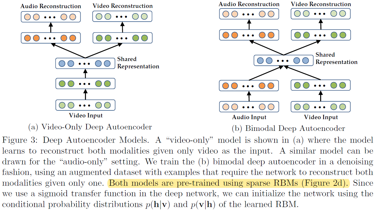결국 오토인코더는 modality-across interation을 더 잘 시키기 위해 도입되었다. fig3의 (a)는 비디오만 인풋으로 받아 비디오와 오디오를 복원해야 하는 오토인코더이다. 만약 이 모델 안에서 modality-cross interaction이 잘 일어나지 않는다면 오디오를 잘 복원할 수 없을것이다. 즉, 오토인코더의 특징을 이용하여 modality-cross intraction을 강제하고 있다. (b)는 denoising autoencoder에서 영감을 받아 만든 모델이라고 한다. 이 모델의 학습 데이터의 1/3은 : No video(video input을 0으로 채움) + audio이고, 또 다른 1/3은 video + No audio, 마지막 1/3은 video + audio이다. 한 쪽 모달리티의 인풋을 0으로 채운 상태로 학습을 하는 건 본직적으로 (a) 모델을 학습시키는 것과 같다고 한다. 그래서 (b) 모델은 한 쪽 모달리티가 부재하더라도 적절한 표현을 만드는 robust한 모델이 될 것이라고 기대할 수 있다. 두 오토인코더는 처음에 figure2의 (d) 파라미터로 초기화된다. Video-Only Deep Autoendoer의 경우 오디오 파라미터는 필요가 없으므로 비디오 파라미터만 가져온다.