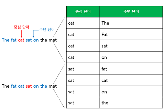 주변 단어들로 중심 단어를 예측하는 태스크를 푸는 CBOW와 달리, Skip-gram은 중심 단어로 주변 단어를 예측한다. 마찬가지로 자기 전후로 몇 개를 예측할 지가 윈도우 크기이다.