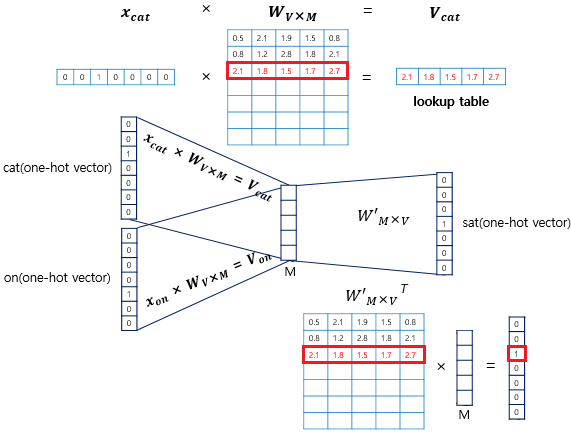 학습을 통해 얻은 각 벡터의 임베딩은 어디있는 걸까? 위 그림으로 설명 가능하다. one-hot vector에 곱해지는 가중치 행렬의 각 행(row)이 바로 각 단어에 대한 word2vec 임베딩이다. one-hot vector에서 $1$인 부분만 가중치 행렬의 특정 행을 활성화시키기 때문이다. 가중치 행렬에서 각 행을 가져오는 연산은 look-up table 이라고 한다.